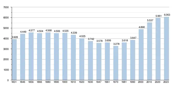 Les chiffres des années 1831 à 1970 tiennent compte des chiffres des anciennes communes fusionnées.