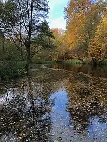 - Les sorties ou pertes d'eau[10] sont celles des exutoires (trop plein), de la percolation vers la nappe (liée à la perméabilité du fond, des berges et du substrat et à la hauteur de l'eau, cf. Loi de Darcy), l'évaporation (E)[11] et l'évapotranspiration (ET)[12],[13] des plantes aquatiques de surface, de la ceinture de végétation et des arbres dont les racines peuvent prélever de l'eau dans l'étang[14]. Il faut aussi parfois tenir compte de conditions particulière de froid/gel déshydratant[15].
