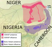 Après le scission de 2016, la faction de Shekau conserve comme fief la forêt de Sambisa[22], tandis que la faction de Barnaoui s'implante au nord-est de Maiduguri et dans la région du lac Tchad[23],[24],[25]. La plupart des combattants de l'EI en Afrique de l'Ouest prennent le parti d'al-Barnaoui[26],[11].