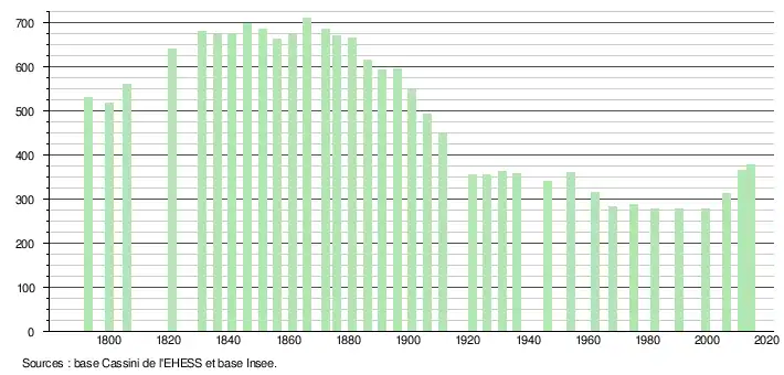 L'évolution du nombre d'habitants est connue à travers les recensements de la population effectués dans la commune depuis 1793. Pour les communes de moins de 10 000 habitants, une enquête de recensement portant sur toute la population est réalisée tous les cinq ans, les populations légales des années intermédiaires étant quant à elles estimées par interpolation ou extrapolation[14]. Pour la commune, le premier recensement exhaustif entrant dans le cadre du nouveau dispositif a été réalisé en 2006[15].