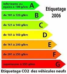 Pour les voitures, ce n'est plus l’efficacité énergétique qui est indiquée dans l'échelle mais le niveau de rejet de CO2 exprimé en grammes par kilomètre parcouru. L'objectif est d'orienter prioritairement les consommateurs vers les voitures les moins émettrices de gaz à effet de serre et de CO2 en particulier, et de supprimer progressivement, faute de demande, les véhicules les plus émetteurs.