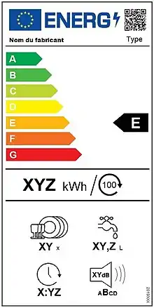 - La classe énergétique : un code couleur associé à une lettre (de A++ à G) qui donne une idée de la consommation d'énergie d'un appareil électroménager.