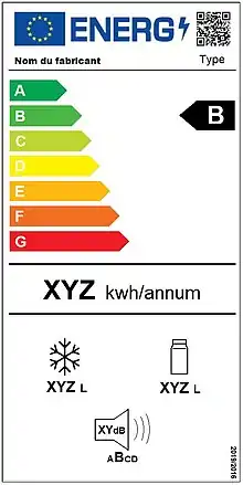 Depuis le 1er septembre 2021, chaque étiquette de réfrigérateur, comprenant les petits réfrigérateurs installés sous les plans de travail, les réfrigérateurs classiques une porte, les réfrigérateurs combinés deux portes et les réfrigérateurs grand volume dit frigo américain, comporte les informations suivantes :