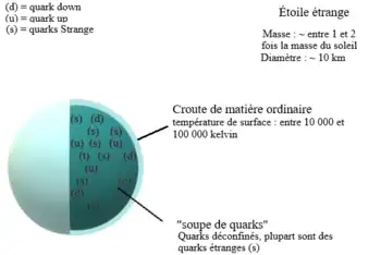 Une telle « étoile » devrait être très petite, plus petite encore que les étoiles à neutrons[4]. Une masse entre une et deux fois celle du Soleil serait ainsi contenue dans une sphère d'une dizaine de kilomètres de diamètre en moyenne[5]. Une croûte de matière ordinaire entourerait cette « soupe de quarks ». La température de surface serait comprise entre 10 000 et 100 000 kelvins et la durée de son existence supérieure à 100 milliards d'années[réf. souhaitée].