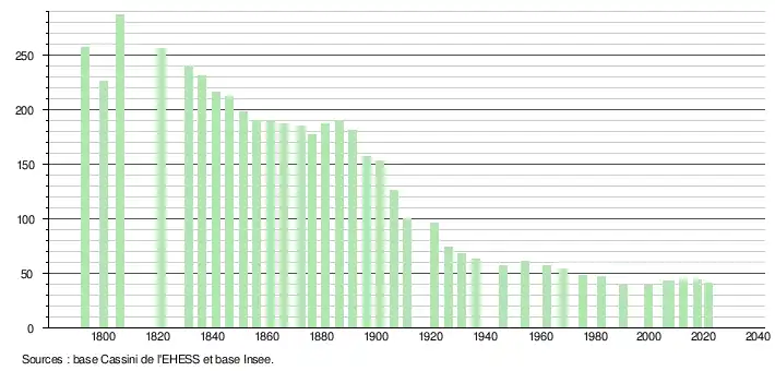 L'évolution du nombre d'habitants est connue à travers les recensements de la population effectués dans la commune depuis 1793. Pour les communes de moins de 10 000 habitants, une enquête de recensement portant sur toute la population est réalisée tous les cinq ans, les populations légales des années intermédiaires étant quant à elles estimées par interpolation ou extrapolation[26]. Pour la commune, le premier recensement exhaustif entrant dans le cadre du nouveau dispositif a été réalisé en 2007[27].