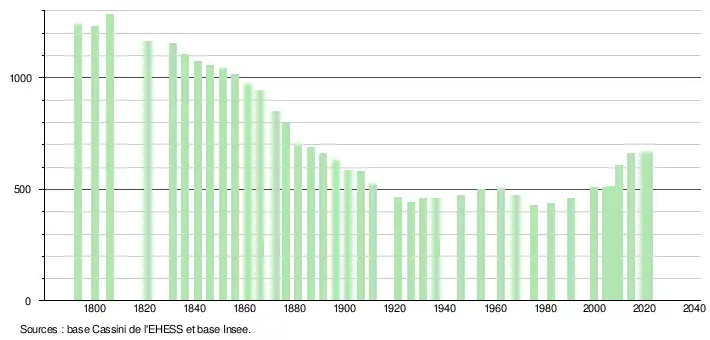 L'évolution du nombre d'habitants est connue à travers les recensements de la population effectués dans la commune depuis 1793. Pour les communes de moins de 10 000 habitants, une enquête de recensement portant sur toute la population est réalisée tous les cinq ans, les populations légales des années intermédiaires étant quant à elles estimées par interpolation ou extrapolation[21]. Pour la commune, le premier recensement exhaustif entrant dans le cadre du nouveau dispositif a été réalisé en 2004[22].