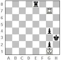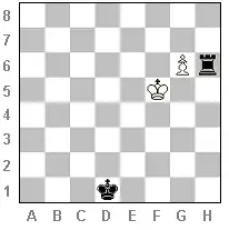 Solution: 1.Th7+! Rg3 2.Te7! Txe7 pat. En effet, les noirs ne peuvent pas vraiment améliorer leur jeu, si par exemple 2...Ta8(ou b8/c8/d8/f8/g8/h8) alors 3.Ta7(b7/c7/d7/f7/g7/h7) TxT pat. Cette étude ancienne présente peut-être le défaut suivant : les blancs n'ont vraiment pas d'autre choix que de jouer les bons coups car la menace 1...Te1+ est très forte. On recherche en général, dans les études d'échecs, un meilleur compromis entre les éléments esthétiques et la difficulté de résolution. Cependant, la chasse de la tour noire sur la huitième rangée est instructive.