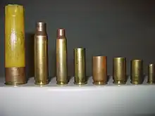 - un bourrelet facilitant le blocage et améliorant l'étanchéité. Les munitions contemporaines comprennent rarement un bourrelet car il réduit la surface de contact de la munition placée dans un chargeur donc complique les composants chargés de l'alimentation et, dans une moindre mesure, de l'extraction et de l'éjection.
