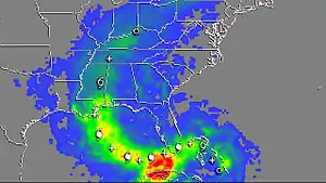 Carte de la pluviométrie associée au cyclone Katrina, qui est passé entre autres au-dessus des Everglades. Contrairement à ce qu'on a d'abord cru, les zones polaires ne sont pas les seules concernées. Certains orages ou cyclones tropicaux liés à un apport d'air marin peuvent contribuer aux pluies de mercure qui constituent de 90 à 95 % des apports de mercure polluant les Everglades[1]. Ce mercure peut provenir des États-Unis comme de l'Europe ou de l'Asie. Mis en contact avec de l'ozone et/ou du brome, ce mercure est en outre rendu réactif et donc plus dangereux.
