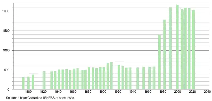 L'évolution du nombre d'habitants est connue à travers les recensements de la population effectués dans la commune depuis 1793. Pour les communes de moins de 10 000 habitants, une enquête de recensement portant sur toute la population est réalisée tous les cinq ans, les populations légales des années intermédiaires étant quant à elles estimées par interpolation ou extrapolation[23]. Pour la commune, le premier recensement exhaustif entrant dans le cadre du nouveau dispositif a été réalisé en 2005[24].