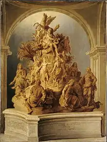 Le monument devait représenter le mont Parnasse, orné de lauriers, de myrtes et de palmiers. Au sommet se trouvait Louis XIV, représenté en Apollon pourvu d’une lyre. Immédiatement en dessous se tenaient les trois Grâces, sous les traits d’Antoinette Deshoulières, Henriette de La Suze et Madeleine de Scudéry. Plus bas, sur une espèce de terrasse faisant le tour de la montagne, Pierre Corneille occupait la place principale, entouré de Molière, Racine, Racan, Lully portant le médaillon de Quinault, Segrais, La Fontaine, Boileau et Chapelle, tenant la place des neuf Muses. En divers points de la montagne devaient être suspendus aux lauriers ou portés par des génies des médaillons de poètes ou de musiciens moins célèbres.