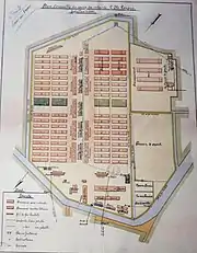 Dessin représentant une partie du camp des internés de l'Île Longue pendant la Première Guerre mondiale.