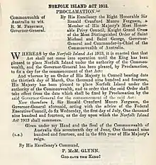 Après la création du Commonwealth of Australia en 1901, l’île Norfolk est placée sous l’autorité du nouveau gouvernement du Commonwealth, en tant que territoire extérieur.