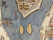 L'île aux Juifs sur le plan de Belleforest (1575), elle est en bas de l'île de la Cité, sur la droite.