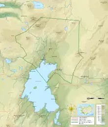 Vue de la partie septentrionale des Þingvellir depuis le rebord sud-ouest du horst avec au premier plan la Öxará, dominés à droite par la Hrafnabjörg ; à gauche au dernier plan se trouve le Skjaldbreiður. | ||
