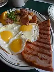 Le jambon doit être bien rose[26]. Le plus usuel est le jambon de Paris découpé soit à l'ancienne c'est-à-dire une rondelle de jambon qu'on pose au fond du moule, soit en lanière qui entoure l'œuf[42]. Autres jambons cuits: l'aspic suisse au foin de jambon, œuf dur et du jambon au foin (« étincellent à travers la gelée limpide »), le jambon d'York[43],[44],[40]. Dans le Morvan les œufs au jambon de Pâques se font de jambon cru dessalé, cuit, qu'on mange chaud ou froid avec des œufs dans la gelée du court bouillon (recette proche du jambon persillé)[45].