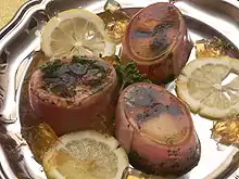 Tradition pascale d'œufs à la gelée de jambon préparés comme pour le jambon persillé, disposé dans des moules avec des œufs durs[90]. On dit aussi œufs à la gelée de jambon[91].