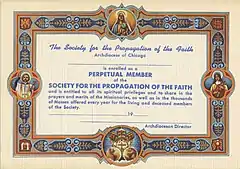 L'Œuvre pontificale de la Propagation de la Foi est l'une des quatre œuvres regroupées sous la bannière des Œuvres pontificales missionnaires (avec l’Œuvre Pontificale de la Sainte Enfance[13], l’Œuvre Pontificale de Saint Pierre Apôtre[14] et l'Union pontificale missionnaire[15]).