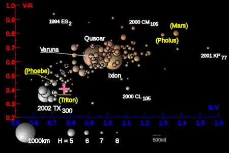La croix rose indique 2005 RR43 (B-V=0.77, V-R=0.41) sur ce diagramme des indices de couleur des transneptuniens. Tous les autres membres de la famille de Hauméa (2005 CB79: 0.73, 0.37) sont situés en bas à gauche de ce point.