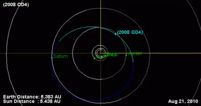 (315898) 2008 QD4 a la plus petite distance de périhélie. En raison de son inclinaison orbitale de 41°, il se trouve au-dessus du plan de l'écliptique quand il croise l'orbite de Jupiter et en-dessous du plan quand il croise l'orbite de Saturne.