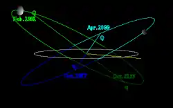 Les périhélie et aphélie sont identifiés par date de passage. Les positions actuelles (pour ) sont identifiées par les sphères illustrant des tailles et des différences relatives dans l'albédo (les deux objets semblent neutres dans le spectre).
