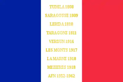 Les noms de huit batailles s'inscrivent en lettres d'or sur le drapeau, ainsi que l'inscription A.F.N[5],[6]