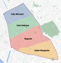 - Quartier de la Roquette (43e quartier de Paris) limité au nord par la rue du Chemin-Vert, à l'est par le boulevard de Ménilmontant et une partie du boulevard de Charonne, à l'ouest par une partie du boulevard Beaumarchais, la place de la Bastille et au sud par une partie de la rue du Faubourg-Saint-Antoine et par la rue de Charonne ;