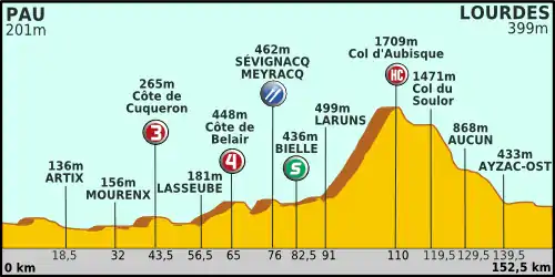L'étape entre Pau (Pyrénées-Atlantiques) et Lourdes (Hautes-Pyrénées) comporte une seule réelle difficulté majeure, le Col de l'Aubisque, hors-catégorie situé à 42 kilomètres de l'arrivée. En outre, deux côtes de 3e et 4e catégories sont jonchés le long du parcours à 43,5 km et 65 km du départ, en plus du sprint intermédiaire de Bielle (Pyrénées-Atlantiques) après 82,5 km de course.