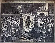 16 octobre : exécution de Latimer et Ridley, illustration du John Foxe's book of martyrs (1563)
