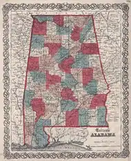 Carte des comtés de l'Alabama en 1859. Le 15th Alabama a été recruté dans les comtés du sud-est de l'État.