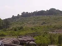 Little Round Top de nos jours, vu de Devil's Den. L'assaut du 15th Alabama Infantry est lancé sur la partie de la colline à l'extrême droite de la photo.