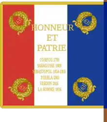 L'étendard régimentaire reprend les noms de batailles portés par celui du 3e régiment d'artillerie à pied : Corfou 1799, Saragosse 1809, Sébastopol 1854-55, Puebla 1863, ainsi que deux nouvelles inscriptions : Verdun 1916 et Somme 1916[9].