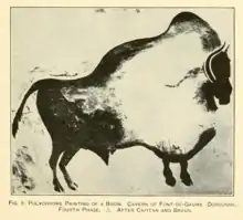 - Entre 15 000 et 10 000 AP : gravures de la grotte des Combarelles et des peintures dans la grotte voisine de Font-de-Gaume (Dordogne), reconnues en 1901 et datées plus tard du Magdalénien moyen[37]. En 1902, l'existence de l'art préhistorique est officiellement admise par les scientifiques. D'autres sites sont découverts par la suite en France et en Espagne (Lascaux, Altamira, Niaux, Rouffignac, etc.). Au cours de ces dernières années, des œuvres d'art pariétal d'un âge voisin ont été découvertes dans d'autres régions du monde telles que l'Australie ou l'Afrique du Sud.