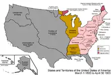 - 30 avril : traité de cession de la Louisiane (2 millions de km²) de la France aux États-Unis (dirigés par Thomas Jefferson), pour 15 millions de dollars (80 millions de francs au total) étendant les États-Unis à l'ouest du Mississippi. À l'est, une controverse éclate avec la Floride Occidentale pour savoir jusqu'où la Louisiane s'étend[4]. Le territoire vendu s'étend légèrement au nord des frontières actuelles, car il est seulement défini par le bassin du Mississippi[5]. Il comprend la totalité des actuels Arkansas, Kansas, Iowa, Missouri, Nebraska et Oklahoma, et des portions du Colorado, Louisiane, Minnesota, Montana, Nouveau-Mexique, Dakota du Nord, Dakota du Sud, Texas et Wyoming. Il inclut également le sud des actuelles provinces canadiennes de l'Alberta, du Manitoba et de la Saskatchewan. Après l’achat de la Louisiane, Jefferson propose au Congrès d’encourager les Indiens à s’établir sur des lopins comme éleveur et agriculteur et d’abandonner la chasse. Il préconise de les inciter à commercer avec les Blancs et à contracter des dettes qu’ils rembourseraient par la vente de leurs lopins.