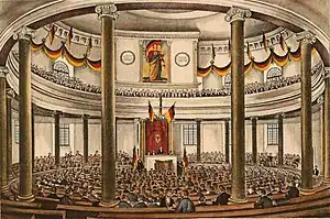 - 18 mai : parlement de Francfort[36]. Il adopte le drapeau noir, rouge et or, désigne un Ministère impérial et prépare la Constitution du Reich à venir, mais sans supprimer l’ancienne Diète. Elle se divise bientôt entre partisans de la solution grande-allemande (großdeutsche Lösung), favorables à une Allemagne fédérale comprenant l’Autriche et s’étendant de la Baltique à l’Adriatique, et ceux de la solution petite-allemande (kleindeutsche Lösung), favorables à une Allemagne plus petite, sans l’Autriche et sous l’autorité prussienne. Les libéraux prussiens dénoncent le gouvernement provisoire, confié à l’archiduc d’Autriche Jean.