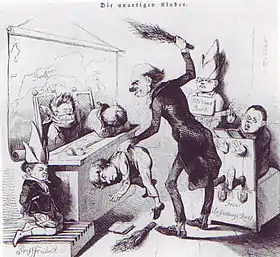 Le mauvais élève, caricature allemande de 1849. Les inscriptions disent : liberté de la presse, d’assemblée, de discourir, d’association... La carte de l’arrière-plan mentionne la Prusse.