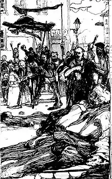 - 22 janvier ( du calendrier julien) : dimanche sanglant (ou dimanche rouge) à Saint-Pétersbourg[67]. La manifestation pacifique menée par le pope Gapone, revendiquant de meilleures conditions de travail pour les ouvriers russes est froidement réprimée, sur ordre du tsar : les cosaques font plus d’un millier de morts (96 officiellement). Vague de grèves dans tout l’empire[66]. Début de la révolution russe de 1905.