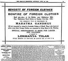 30 juillet, Inde : boycott des vêtements étrangers, annonce parue dans The Bombay Chronicle