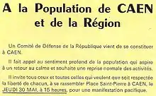 Après l'incendie du siège de l'UD 5e, puis cette opération Caen ville fermée, les partisans du pouvoir s'organisent. Un comité de défense des libertés est mis en place alors que les accès de la ville sont bloqués par les grévistes. Une délégation de ce comité se rend à la préfecture pour signaler sa création. L'accueil du préfet est chaleureux. Celui-ci apprend à la délégation qu'une manifestation aura lieu le lendemain à Paris pour soutenir de Gaulle. Le comité décide donc de convoquer une manifestation pour le jeudi à 15h place Saint-Pierre. La manifestation est annoncée via des tracts distribués durant la matinée et une escouade de voitures munies de haut-parleurs. À 15h, il y a déjà plusieurs milliers de gaullistes mais, aussi, de leur propre initiative, des étudiants et des grévistes. La Marseillaise répond à l'Internationale et inversement. Les partisans de l'ordre sont environ 7 000. Ils défilent avec des banderoles demandant la liberté de travailler mais aussi la liberté d'expression. Les manifestants passent devant la préfecture où le préfet Gaston Pontal reçoit une délégation. Les manifestants poursuivent leur périple en se dirigeant vers le monument aux morts de la place Foch. Les étudiants et les ouvriers veulent les empêcher et forment une chaîne. Ils se font charger et sont obligés de céder face aux gaullistes qui entonnent une Marseillaise. Les partisans de l'ordre prennent ensuite la direction de la place de la Résistance pour se recueillir sur le monument aux déportés. La manifestation se termine devant la préfecture où le préfet a fait installer des haut-parleurs pour diffuser l'allocution du général de Gaulle.