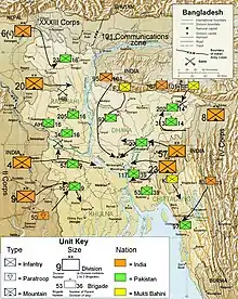 - 15 décembre : le général en chef des troupes du Pakistan oriental demande un cessez-le-feu à l’ONU et signe sa reddition[60]. Indépendance du Bangladesh. Islamabad lance toutefois plusieurs offensives dans le Cachemire, le Pendjab et le Rajasthan. Les Indiens contre-attaquent sans obtenir de résultats décisifs.