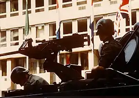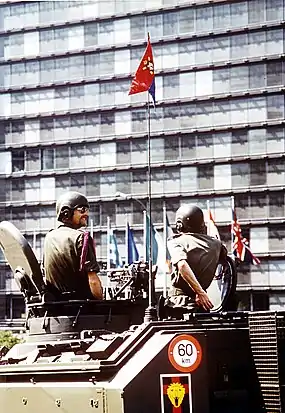 Le 1er régiment d'artillerie de campagne défilant devant le roi le 21 juillet 1989 à Bruxelles avec des M109A2. | |