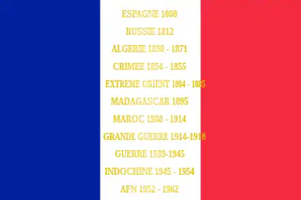 Espagne 1808 Russie 1812 Algérie 1830-1871 Crimée 1854-1855 Extrême-Orient1884-1885 Madagascar 1895 Maroc 1908-1914 Grande Guerre 1914-1918 Guerre 1939-1945 Indochine 1945-1954 AFN 1952-1962 |