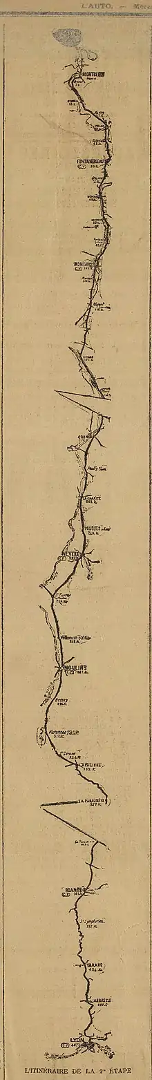 Gustave Pasquier lance la première attaque du Tour de France, quelques kilomètres seulement après le départ. Sous l'effet de cette attaque, le peloton roule à vive allure et certains coureurs sont déjà lâchés[3]. Édouard Wattelier, l'un des principaux engagés sur ce Tour, est le premier coureur à abandonner, contraint de rouler pendant 18 km avec un pneu crevé, au contrôle volant de Montargis (Loiret), après seulement 102 km de course[4]. Après six heures de course, le peloton atteint Cosne (Nièvre), où la plupart des coureurs décident de s'arrêter pour se ravitailler dans une auberge. Maurice Garin, Émile Pagie et Léon Georget ne s'arrêtent pas et se portent en tête de la course. Au contrôle fixe de Nevers (Nièvre), Garin et Pagie sont seuls en tête après une crevaison de Georget[4].