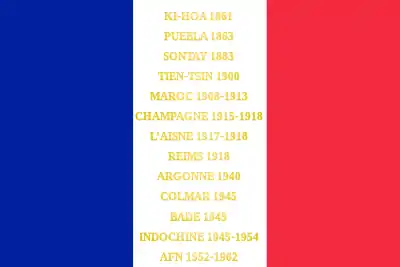 Les noms des batailles s'inscrivent en lettres d'or sur le drapeau, ainsi que l'inscription A.F.N [1],[2]: