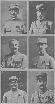 Les colonels du 293e RI. Première ligne : Desgrées du Loû et Gouvello. En dessous : Arnaudeau et Manceron. En bas : Thouraud de Lavignère et Ménestrier.
