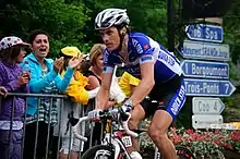 ![]() Mickaël Delage, ici aux Quatre Jours de Dunkerque 2010, est victime d'une chute provoquée par un chien lors de la 1re étape du Tour de France 2010. |