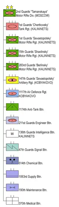 - 1er régiment de fusiliers motorisés de la Garde Sebastopolski (« de Sébastopol ») (retourné à sa numérotation de la Seconde Guerre mondiale à partir du numéro précédent 73 en 1990), n° d'unité 31135 ;