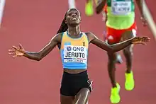 Norah Jeruto, naturalisée Kazakhe en 2022, remporte la médaille d'or du 3 000 m steeple lors des championnats du monde 2022 à Eugene, en s'imposant dans le temps de 8 min 53 s 02, nouveau record des championnats, après avoir mené la course pratiquement du début à la fin. Elle devance les Éthiopiennes Werkuha Getachew et Mekides Abebe[20]. L'Ougandaise Peruth Chemutai, championne olympique en 2021 à Tokyo, termine à la 11e place.