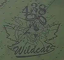 Le 10 février 1944, le pilote du 438e Escadron et vétéran de l'Alaska, le Flight Lieutenant Ross Reid D.F.C., a écrit une lettre à Walt Disney lui demandant de concevoir un emblème pour l'escadron, emblème qui pourrait orner leurs avions. Alors qu'il servait à l'île Annette aux côtés de ses collègues américains de l'USAAF, Reid avait remarqué les nombreux avions militaires américains ornés de conceptions artistiques complexes. Reid a reçu une lettre des Studios Disney datée du 30 mars 1944 contenant le dessin ci-dessous qui a été immédiatement adopté et peint sur les capots des typhoons de l'Escadron avec l'ajout d'une feuille d'érable comme arrière-plan. À la fin de la guerre, à Flensburg, en Allemagne, dans l'attente de leur rapatriement, les membres de l'Escadron ont commandé une épinglette d'un bijoutier local sur la base du modèle Disney (voir photo ci-dessous). Le design populaire de Disney a de nouveau été choisi pour orner à la fois les avions et les uniformes du personnel de l'escadron en 1981 à la suite d'une série d'écussons portés au fil des décennies. Un panneau de nez CH-146 Griffon spécial porte également l’emblème original de 1944, pour être utilisé pour des occasions spéciales. C'est toujours l'emblème de choix des Wildcats.