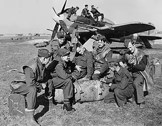 Personnel au sol de l'Esc 438 avec un chasseur-bombardier Typhoon Eindhoven, Pays bas en 1945. |